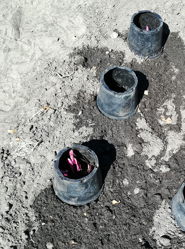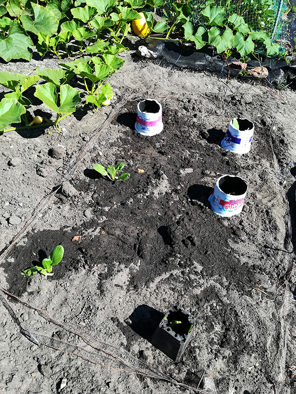 Om de jonge plantjes enigszins te beschermen tegen de hitte, zetten we er plastic bakjes omheen (zwart), die niet gaan werken als een kas, maar juist schaduw geven. Hopelijk gaan ze het op die manier redden. Het zand wat we met onze handen om de plantjes verspreidden, was heet! Op de linker foto zie je de wat zielig ogende bietenplantjes, daarnaast hun bescherming, en daarnaast de paksoi met hún bescherming. Om de paksoi hebben we ook koperdraad gezet tegen de slakken. Ik kan de paksoi nu niet als andere jaren in het kasje zetten, dan verbranden ze.