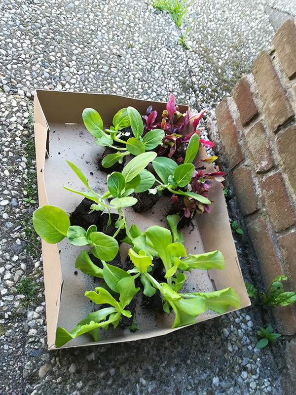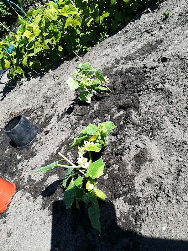 Een hete dag. We wachten tot het eind van de (zondag)middag alvorens naar de tuin te gaan, maar ondanks dat, moeten we regelmatig in de schaduw van het tuinhuisje gaan zitten om het vol te houden. Ik denk dat het dik 25 graden is, en de zon is fel. Toch gaan we het wagen om de lege stukken op de tuin op te vullen. Ik heb bietenplantjes, kropslaplantjes, en paksoiplantjes gehaald in Santpoort. En Corina heeft van de moestuintjes van de grootgrutter een zonnebloem, en twee komkommerplantjes.
