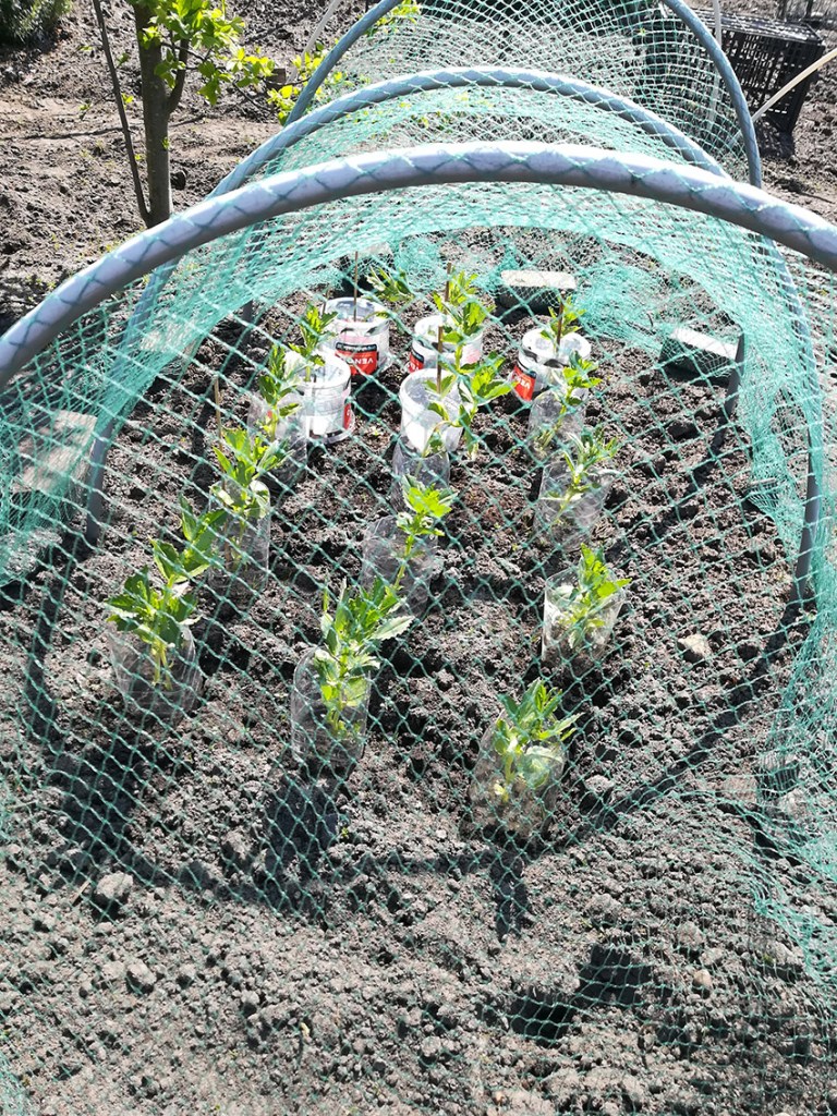 Tussen de buien door doen we heel veel op de tuin vandaag. Corina doet het zware werk. We zetten de aardbeien onder het gaas, ik zet oostindische kers bij de tuinbonen (tegen de luis), en we maken mooie rijen met prei, uitjes, bietjes, en andijvie. De andijvie krijgt bakjes ter bescherming tegen de slakken.