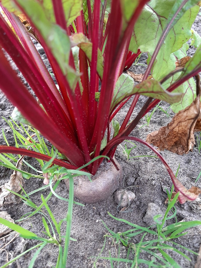 Er is zowaar een rode kool die zijn naam eer aan doet. Ik heb het beschermende (harde) gaas weggehaald, misschien bevordert dat de groei ook nog iets.