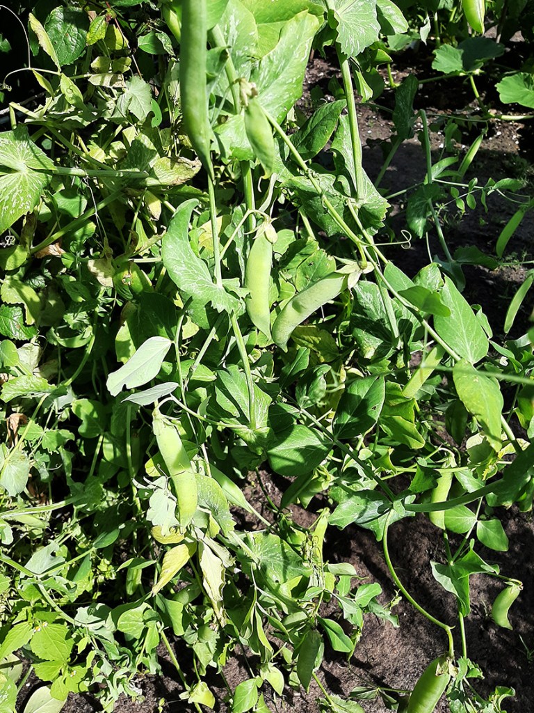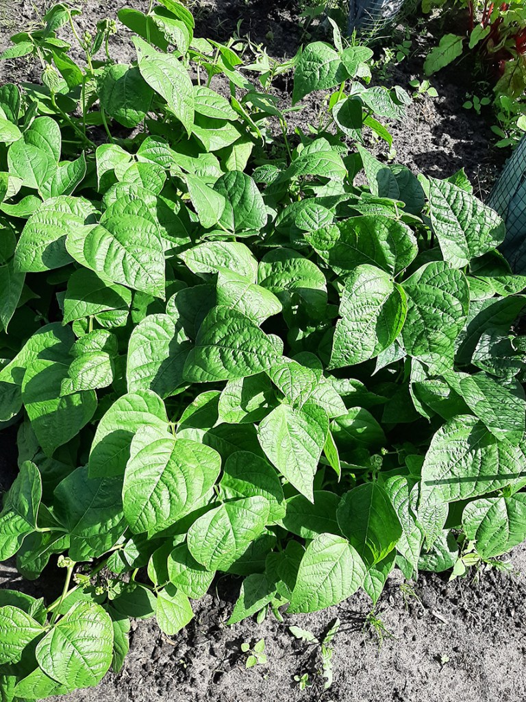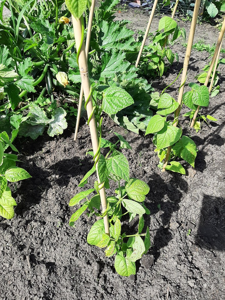 Als bescherming tegen hongerige beestjes doet nu een plastic zak dienst als vogelverschrikker bij de sperzieboontjes. Die zien er ook bijna oogstbaar uit.
