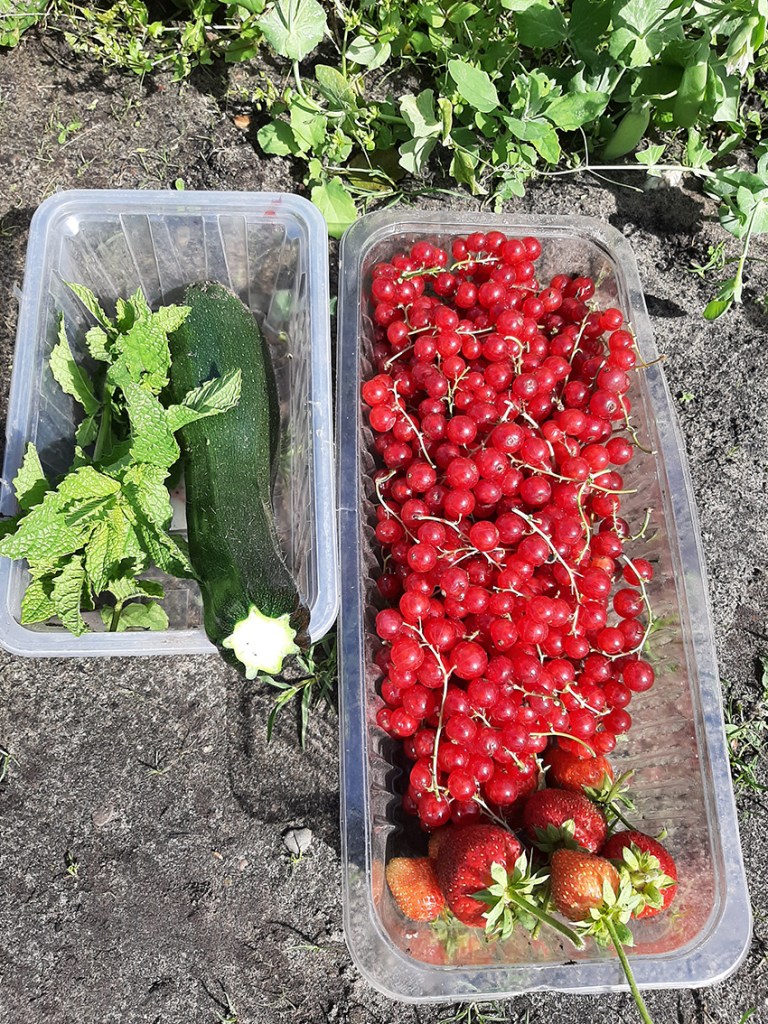 Op het moment eet ik echt van de tuin. De yoghurt wordt verrijkt met aardbeien, gisteren stonden er tuinbonen met spekjes op het menu (linker foto), vanavond eet ik pasta met courgette. Corina heeft de bietjes gekookt. En oh ja, na het werken op het Landje vandaag, heb ik genoten van muntthee. Die tuinbonen komen uit de vriezer, de courgette is de laatste van dit jaar denk ik. Ik heb vanmiddag een veel te grote courgette van de plant gehaald, en verder zat er niets meer aan.