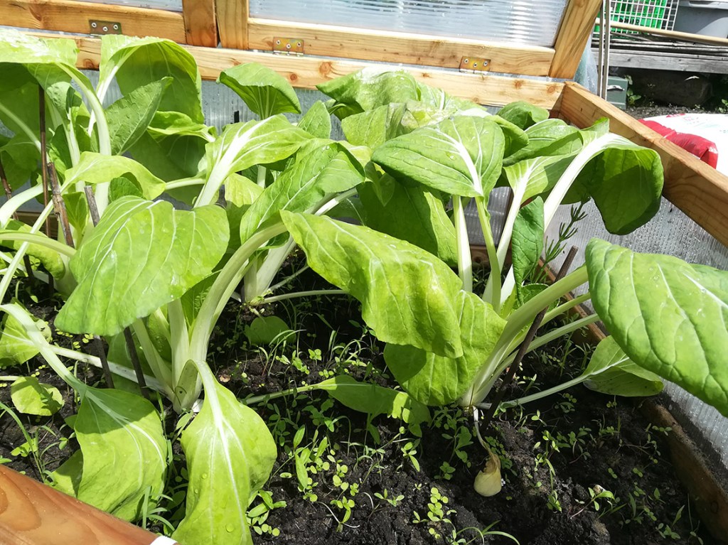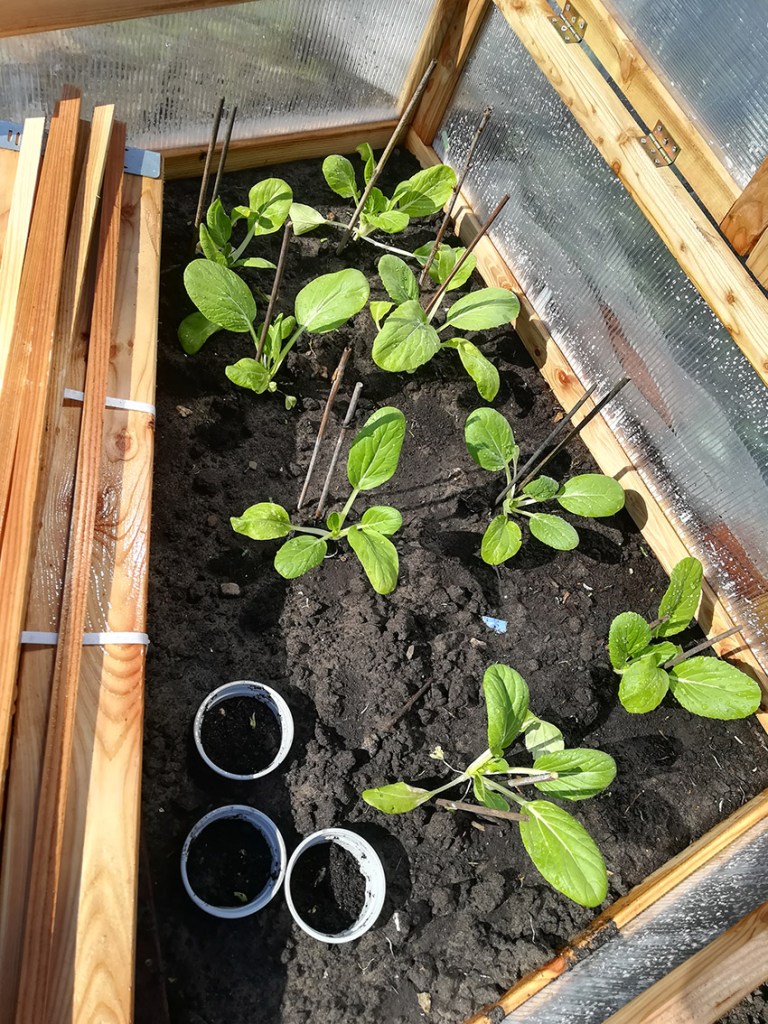 Behalve de paksoi, die in het kasje groeide, loopt alles een beetje achter.