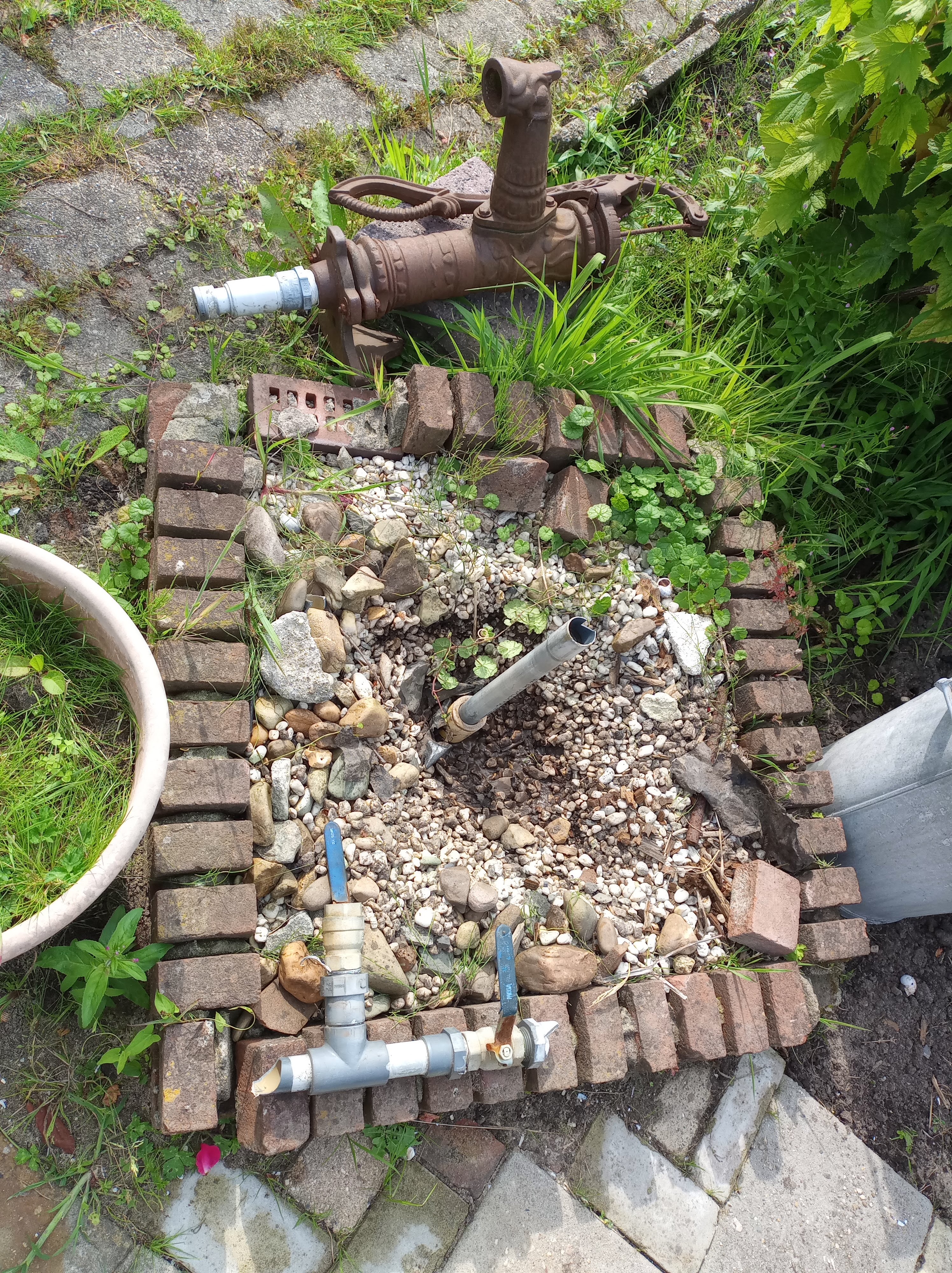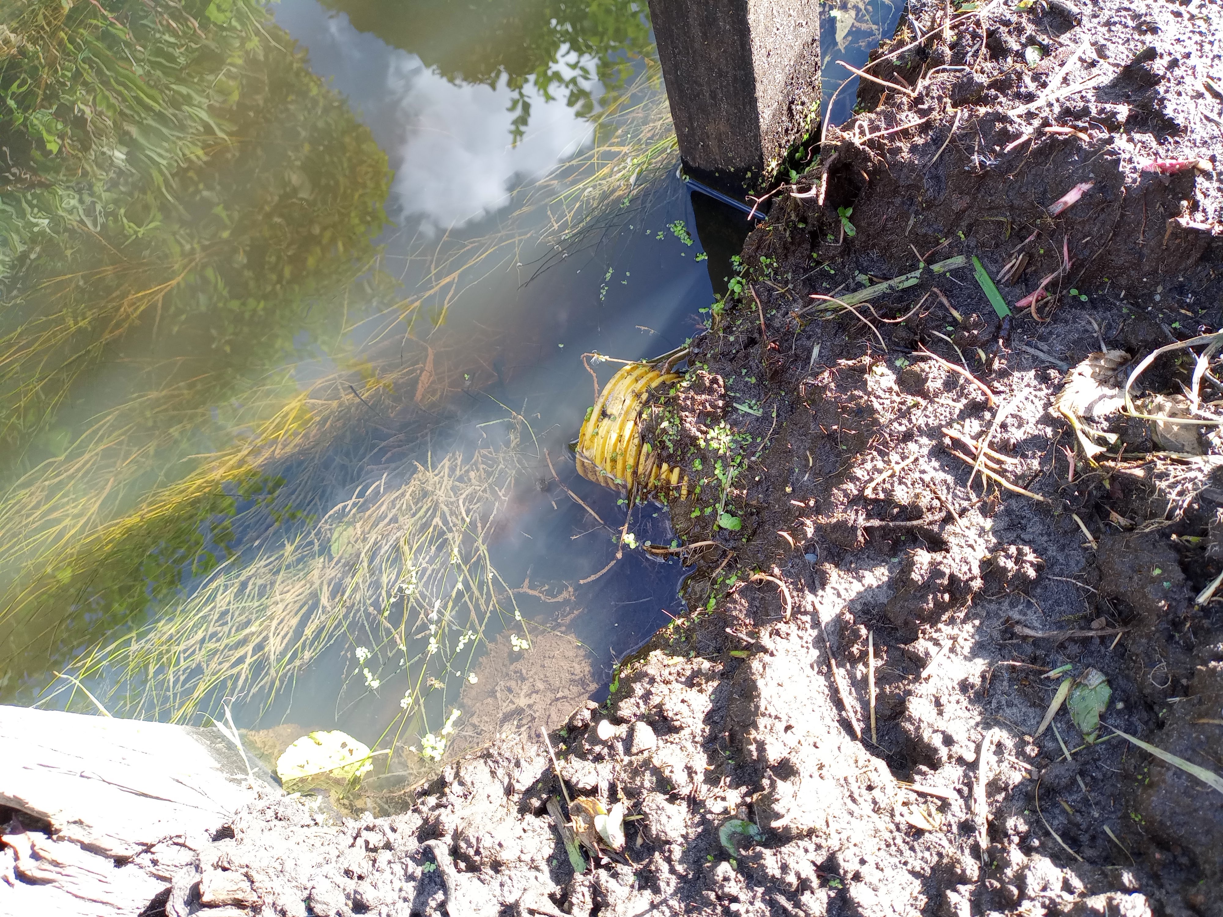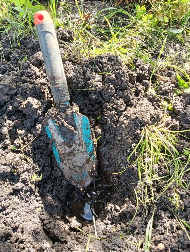 Iets anders wat meteen opvalt, is de nattigheid. Ik verdwijn met mijn laarzen centimeters de grond in, (ook bij het reeds opgehoogde stuk) en bij het schoonmaken van het aardappelveld blijkt het grondwater al zichtbaar na zo/n 20 centimeter scheppen. Zie de foto’s hieronder. De pijp van de afwatering van de tuin ligt nu onder waterniveau (foto 3)