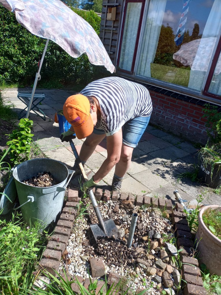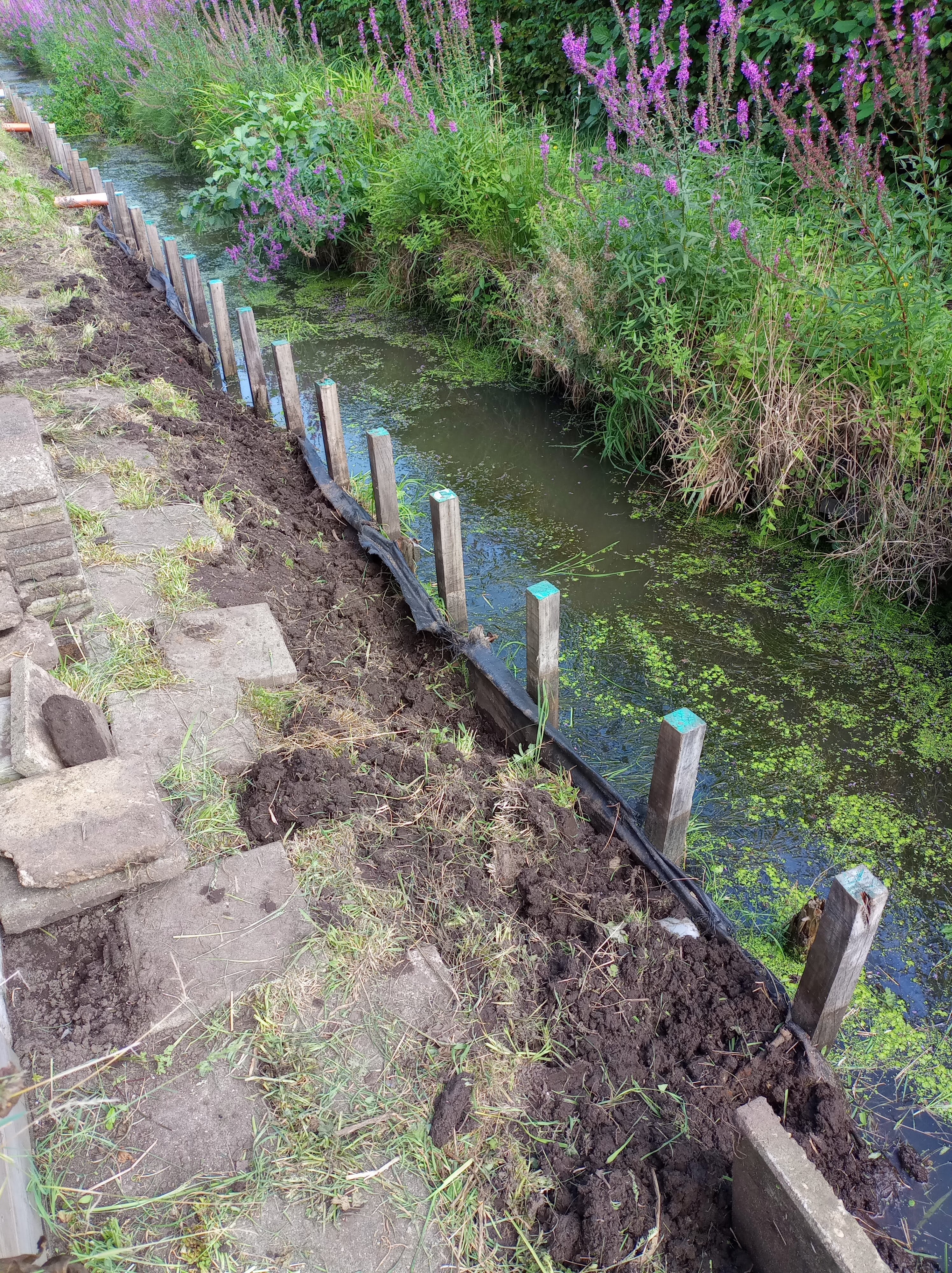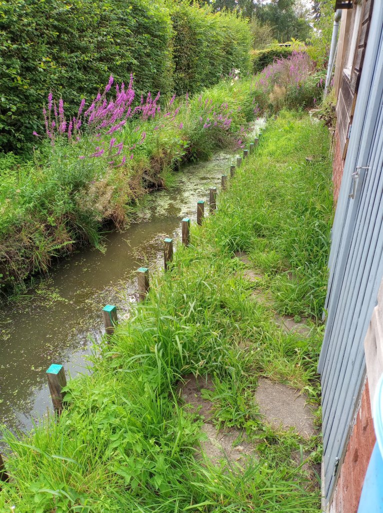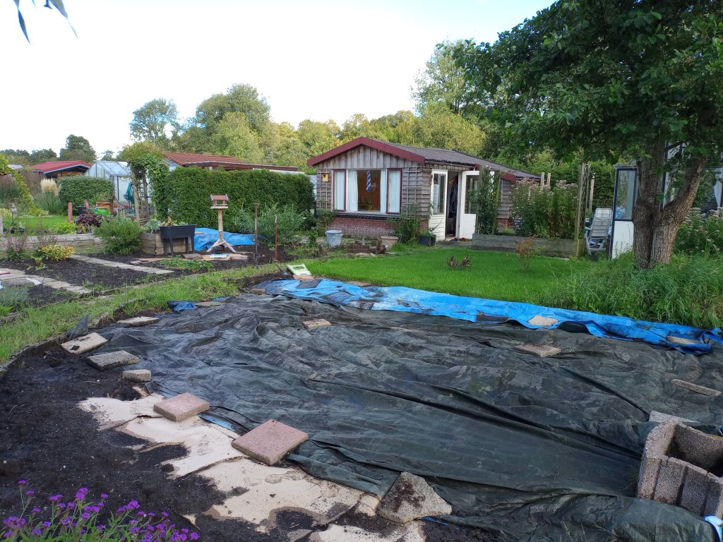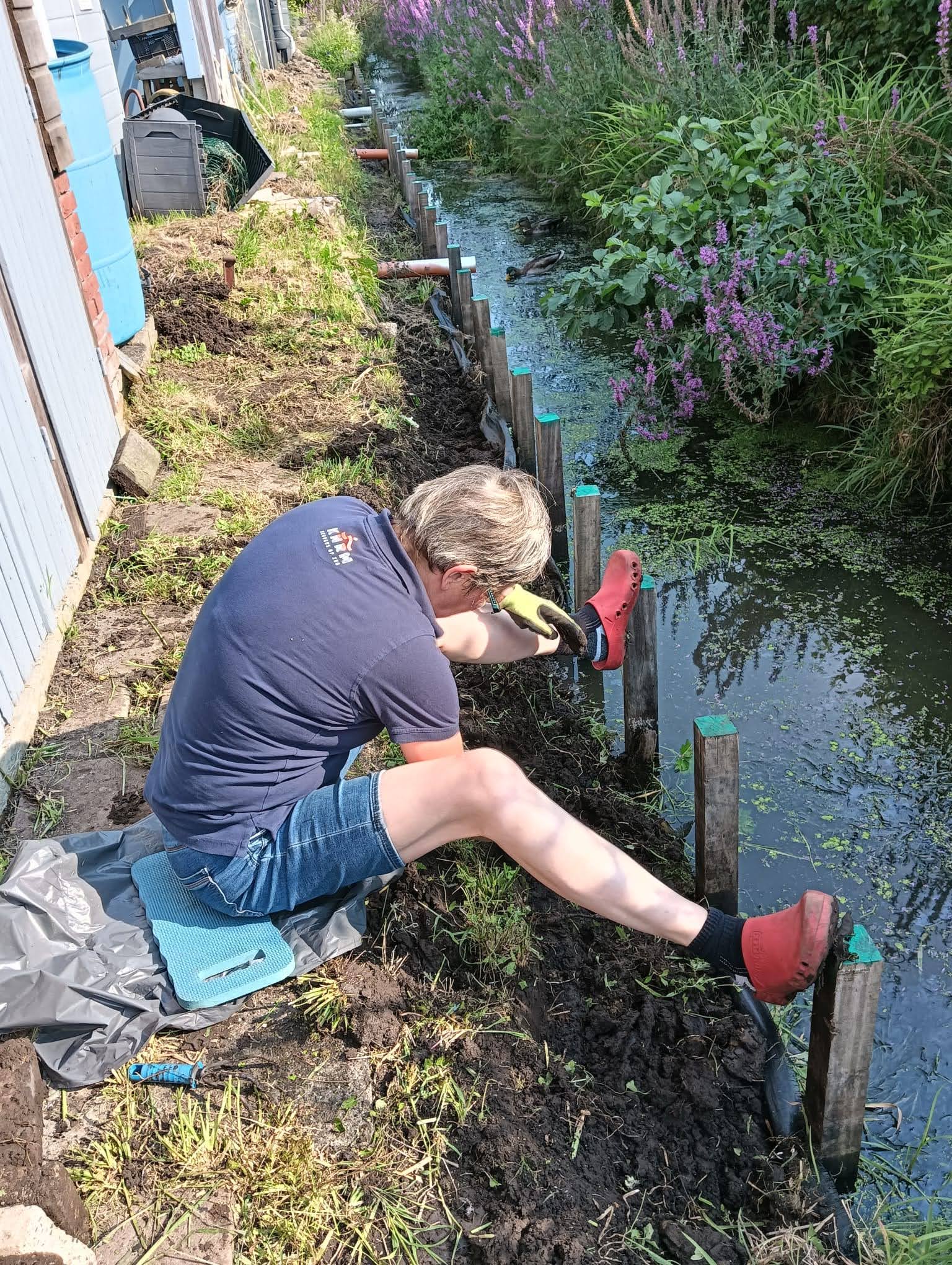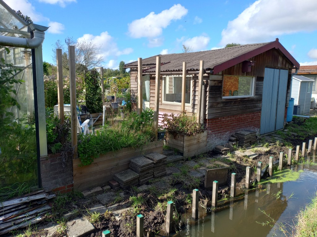 Als we op de tuin komen, blijkt dat er helemaal niet aan de beschoeiing is gewerkt. We balen hier een beetje van. Er was haast bij, alles moest voor afgelopen maandag 9 september vrij zijn van onkruid en toegankelijk. En nu is er niets gedaan, en heeft de regen wel delen weggespoeld. Het wordt steeds lastiger om bij onze gereedschapskast te komen, zonder het risico te lopen in de sloot te belanden.