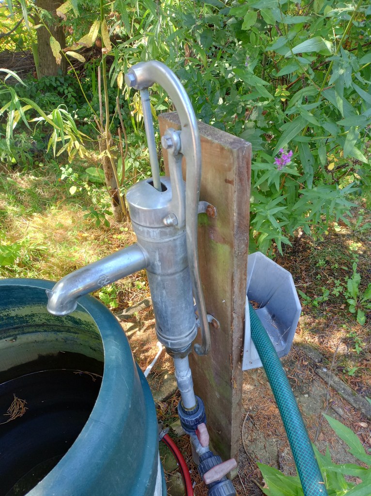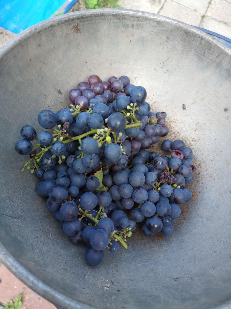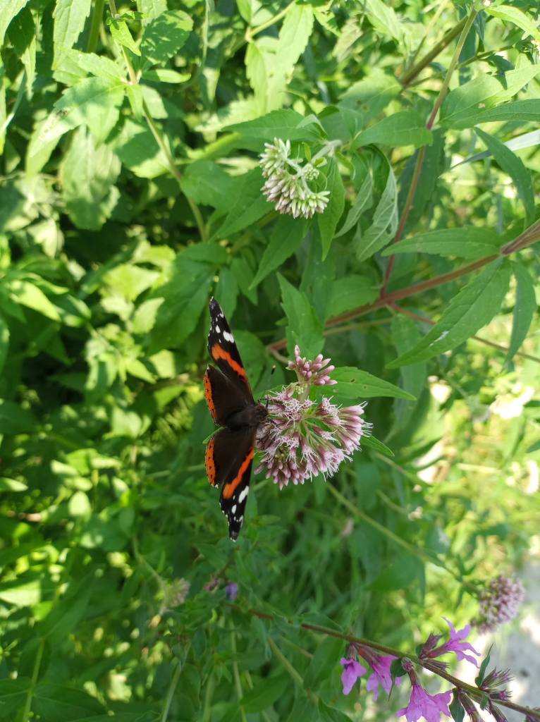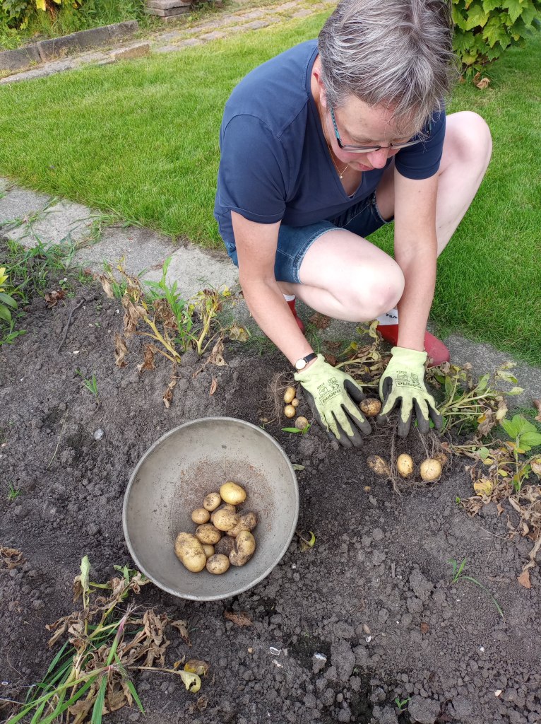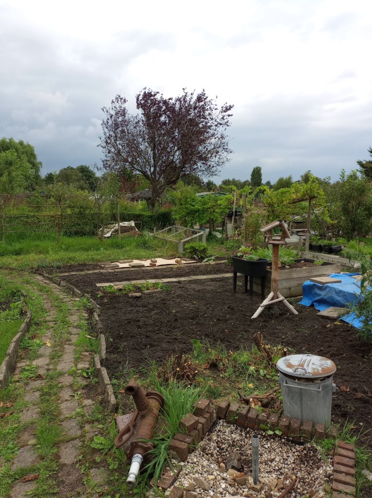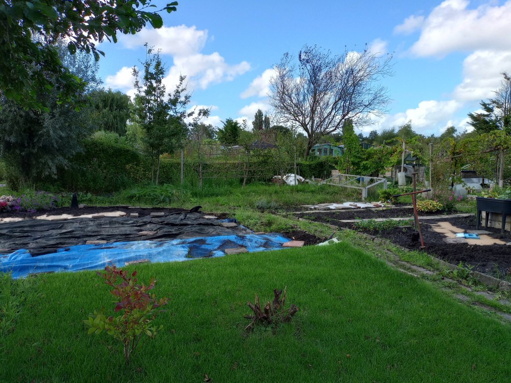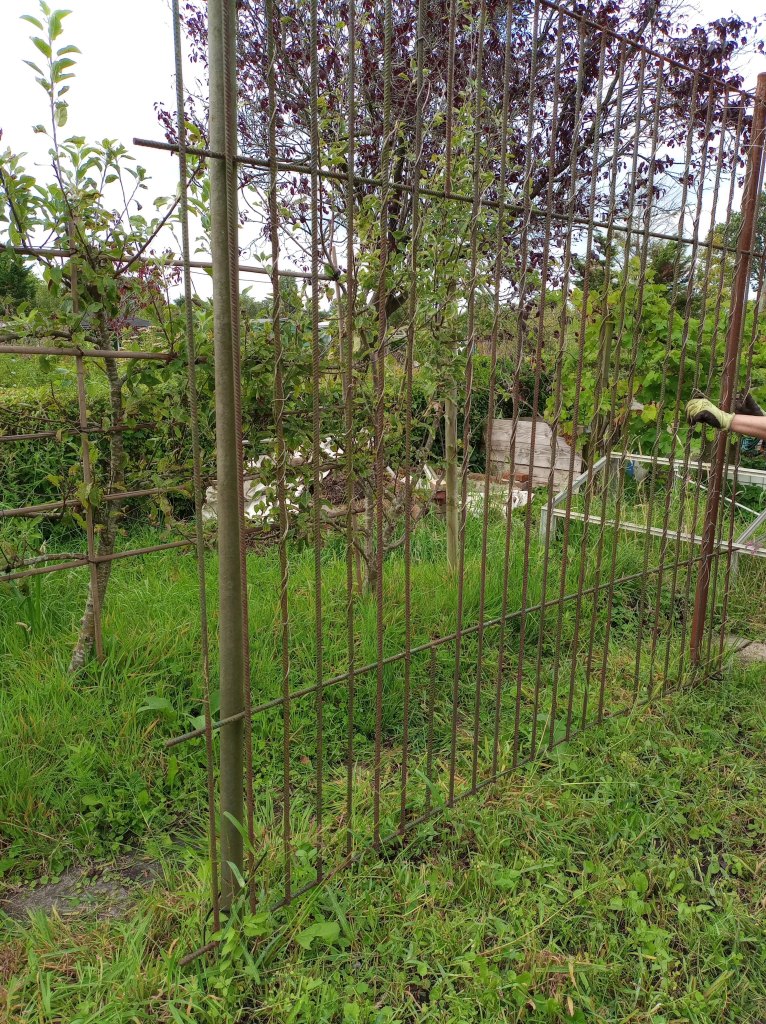 Als we op de tuin komen, blijkt dat er helemaal niet aan de beschoeiing is gewerkt. We balen hier een beetje van. Er was haast bij, alles moest voor afgelopen maandag 9 september vrij zijn van onkruid en toegankelijk. En nu is er niets gedaan, en heeft de regen wel delen weggespoeld. Het wordt steeds lastiger om bij onze gereedschapskast te komen, zonder het risico te lopen in de sloot te belanden.