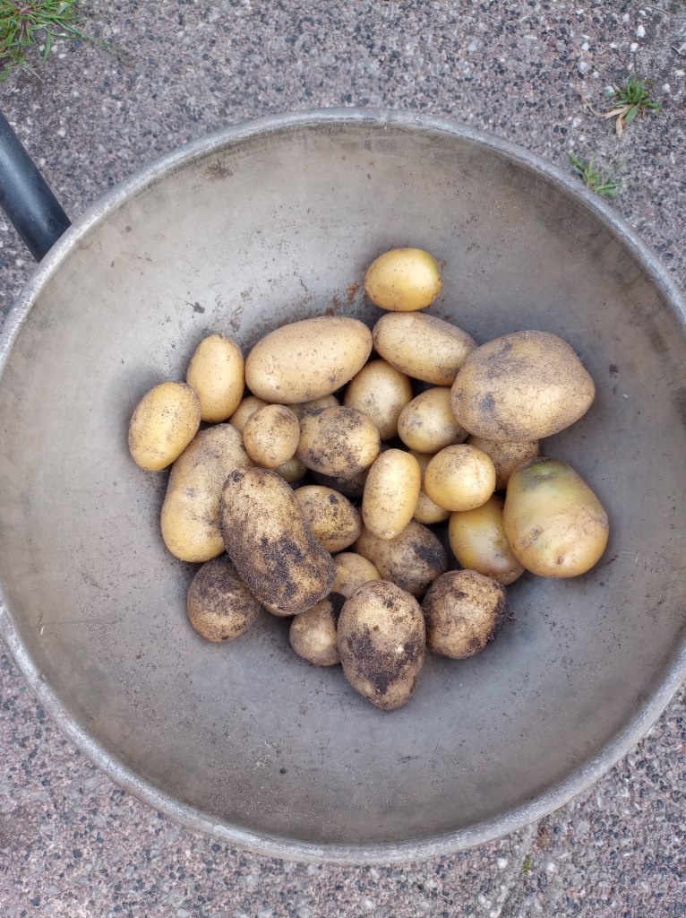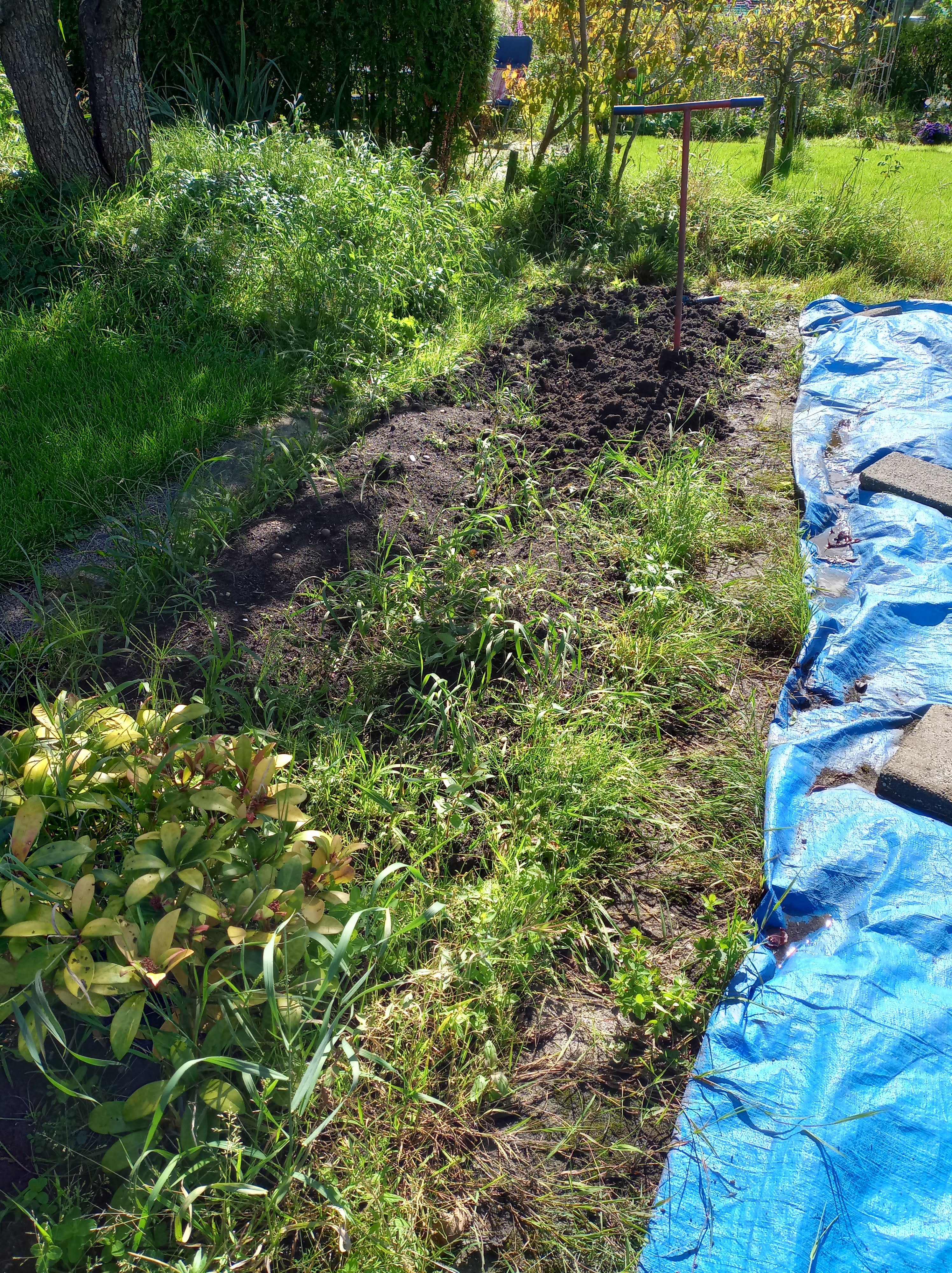 Zoals ik in mijn vorige blog schreef, is het plan om er eind september een gedeelte gras bij te doen. Het stuk wat nu onder blauw zeil ligt, en het stuk waar de aardappelen hebben gestaan. Dezelfde mannen die ons eerste stuk gras een half jaar geleden hebben gelegd, komen ons weer helpen. Om het leggen voor de bereiden, maken Corina en ik vanmiddag dat hele gedeelte schoon en gaan we het egaliseren.