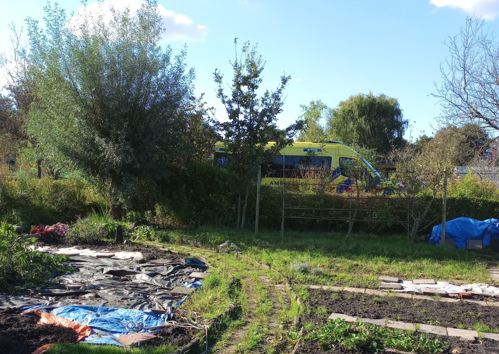 Een half uurtje later komt de man bij mij op een bankje zitten, gaat een appeltje schillen en opeten, en raakt tijdens het gesprek bewusteloos. Geen hartslag. Lang verhaal kort, (want uitgebreider, daar is dit blog niet voor bedoeld), maar na twee keer mijn schreeuw “reanimatie!” over het complex, waar gelukkig 2 mensen op reageerden, en kordate acties van deze blogger en de 2 toegesnelde tuinders, is de beste man met de ambulance naar het ziekenhuis gebracht. Ik wens hem van harte een goed herstel.