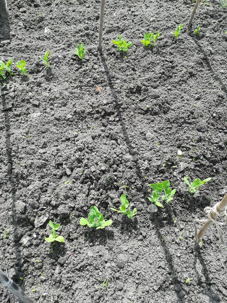Corina heeft verleden week zonnebloemen gezaaid, die komen al op. En boontjes, die gaan ook de lucht in. Ach, en als je dan klaar bent, na een paar heerlijke uurtjes op het Landje, en je kijkt achterom, dan is er alleen maar tevredenheid. Wat een heerlijk plekje hebben we toch.